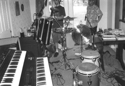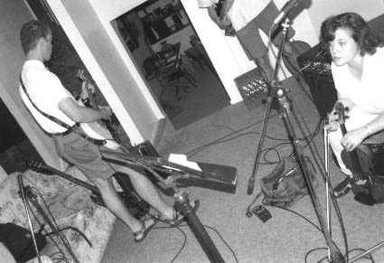 "Drum tracking for 'Burning Witches.'" "Matt Espy and Kelly Morelock during MARTIAN CHRONICLES." "Brad Morris, Julie Martin, and Danny O'Connor's legs during MARTIAN CHRONICLES." "Bench during MARTIAN CHRONICLES."