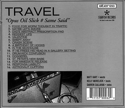 "FOOD FOR WORM THOUGHT IN TRAFFIC" "MAYBE LET'S SMOKE" "DAD'S ABSTRACT PRESCRIPTION PAD" "REDDEST LIPS" "VALENTINE" "SWEPT AWAY" "CRASH SCENE" "A BIRTHDAY OF HOOKS" "IN THE SICKHOUSE" "IF HE FREES HIS HEAD IN A GALLERY SETTING" "DRUM-KICK CONFUSION" "DOGGEREL" "ST. PETER'S NEW BABE" "FOR IMMEDIATE RELEASE" "RESPONSA LIABILITY" "ASTRONAUT CLIFFORD" |
